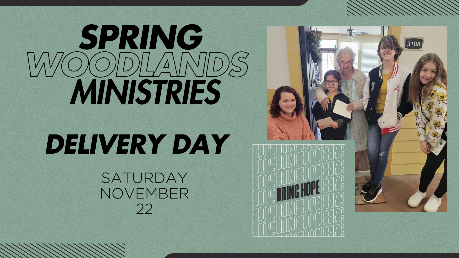 Join our partners at Spring Woodlands Ministries as we help deliver groceries, hams, and pies for the Holiday season. There are two locations for delivery in Spring. Sign up to join us!