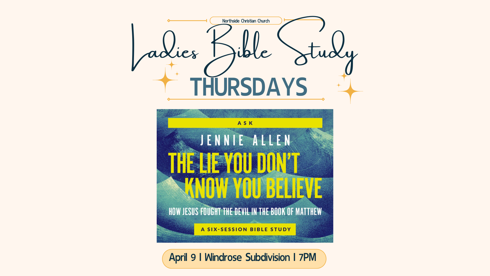 Ladies Bible Study will begin the week of April 9th. You can join Thursday evenings at 7:00pm for a 6 week study on “The lie you don’t know you believe” by Jennie Allen. All the details are in the registration link. I hope you will study with us!